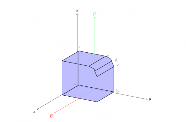 | 3D illustration of the Extrusion 1.0 model. A 2D profile (\textit{a}, \textit{b}, \textit{c}, \textit{d}, \textit{e}, \textit{f}) defined in the paths array is extruded along the $E$ vector with default 'up' as $U$ (parallel to the $z$-axis) by a specified length. It is typically used to generate flat laying surfaces; with $U = Z$, the surface lies horizontally. |