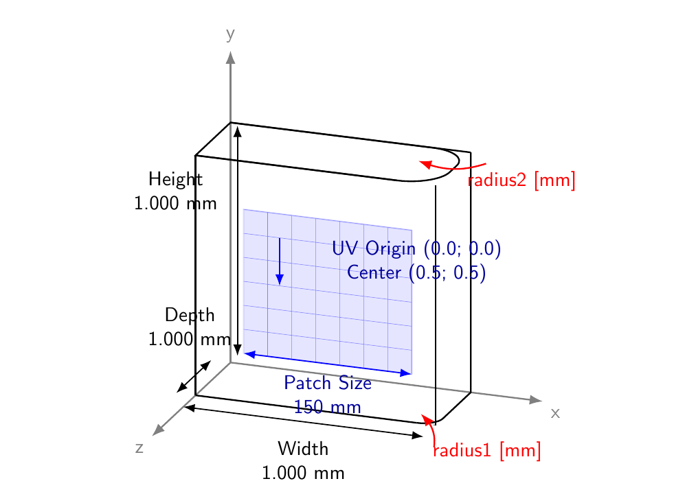Figure 1: 3D illustration of the SOLID1\_1 model, showing dimensions, radii, and UV mapping.