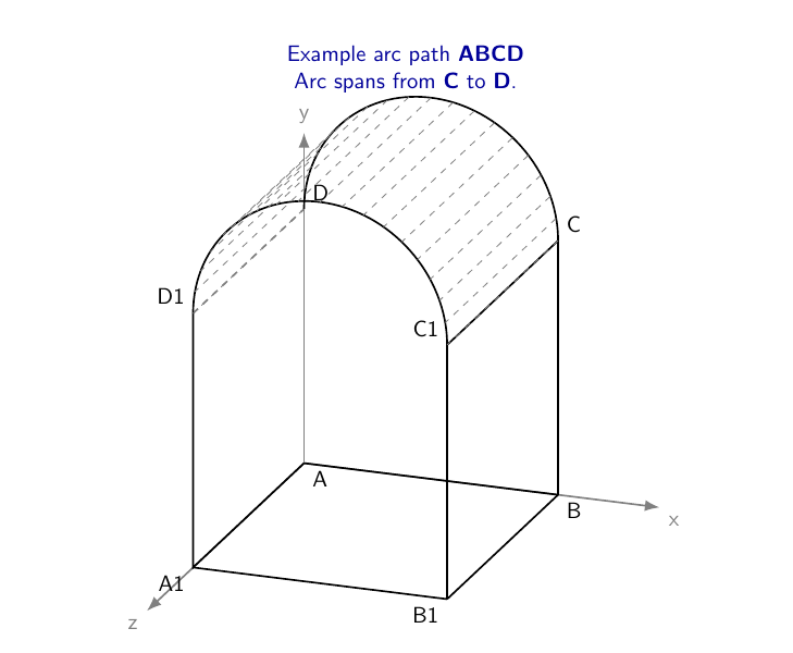 Figure 2: Isometric view of an SOLID1\_3 with arched panel example \textbf{path} with base rectangle ABCD and curved top.} ABCD describes frameWire path points . A1,B1,C1,D1 are generated points from extrusion depth taken from profil path.