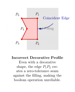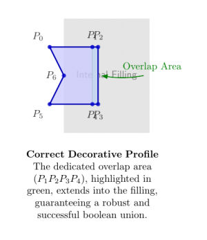 This diagram shows a profile that stops exactly at the boundary of the internal filling. This creates a high-risk “coincident face” or seam, which can cause the boolean union to fail, resulting in rendering artifacts, gaps, or a non-watertight model.
